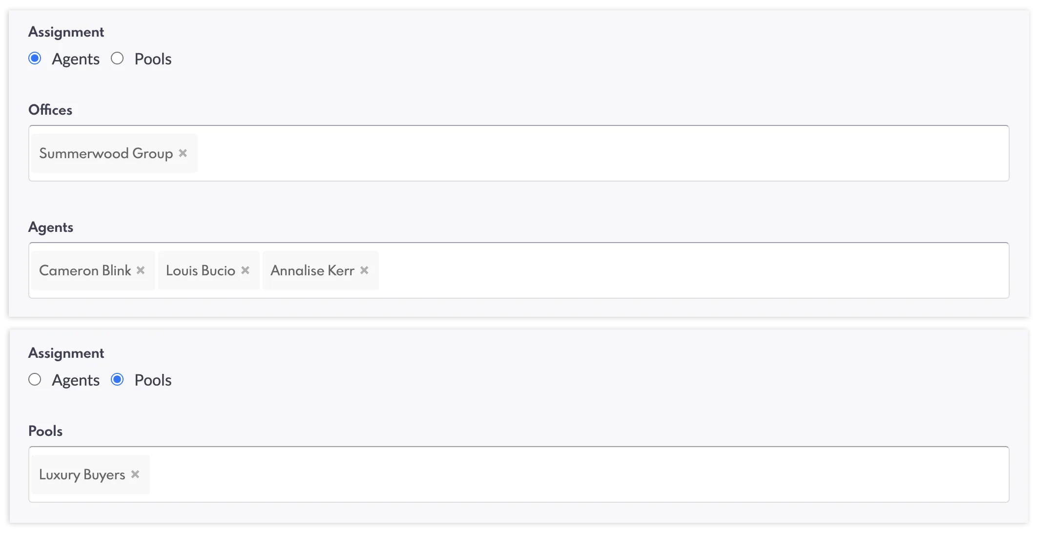6. Once you have selected the requirements for the rule, you can then select whether to assign this to "Agents" or a "Pool". Multiple Agents and Offices can be selected, while Pools sends the Lead to a shared space where Agents get the opportunity to choose their own Leads.