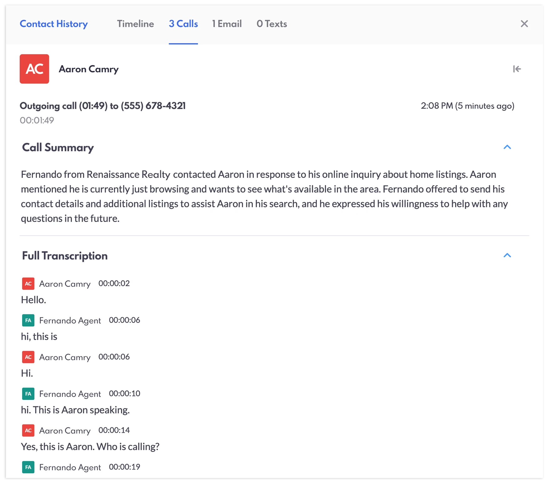 You can find the call transcript and summary on REW CRM’s lead details page. Once you end the call, follow these steps to access them: