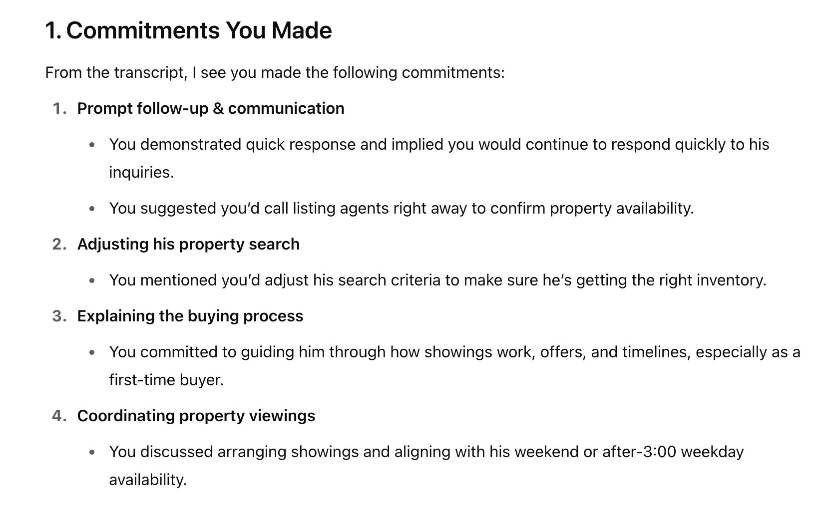 Afterwards, your assistant provides you a complete transcript of your call for posterity and then a summary of the call, including the most important action items you need to take away.