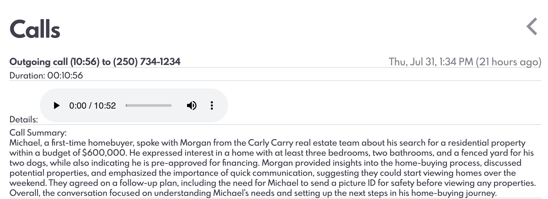 Oh, and of course, in your CRM your assistant also logged the call for you, including the exact date, time, and duration. (no more having to log calls or write notes after the fact - just on to the next call!)