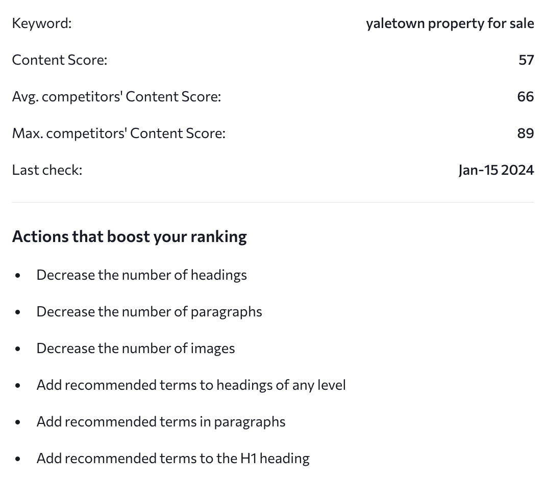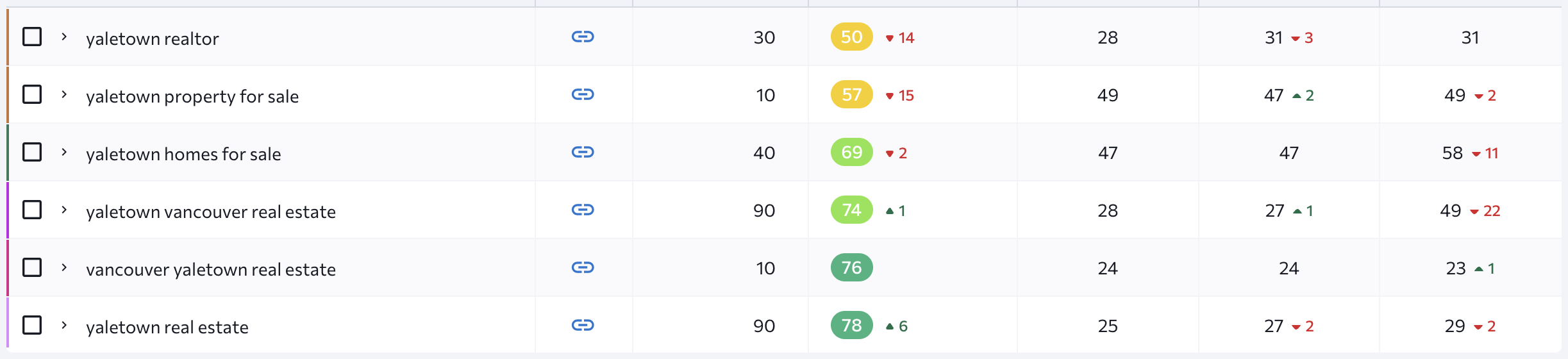 Let’s say I’m trying to rank this page for: Yaletown Real Estate, I can track my keywords and where they are ranking.