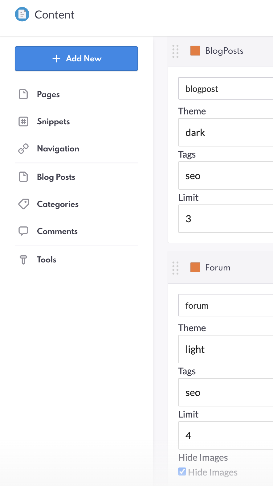 I can then get quite specific with what I want to dynamically embed in those pages based on not only the tags I have created but in our case, we also created different theme designs. Finally as we iterated we determined we wanted to be able to control how many posts or blogs we showed as well as whether we wanted images to show on the page or not (sometimes an image is necessary on a forum for instance but doesn’t look good embedded on a page).