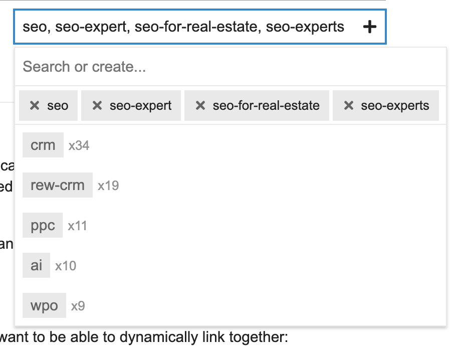 We need to improve the tags though if this is going to be the case, since we should be able to either search or create the tag right there from the blog post or the CMS page: This discourse forum software we use here at REW actually has a nice UI for it - here’s a screen (so let’s make this)