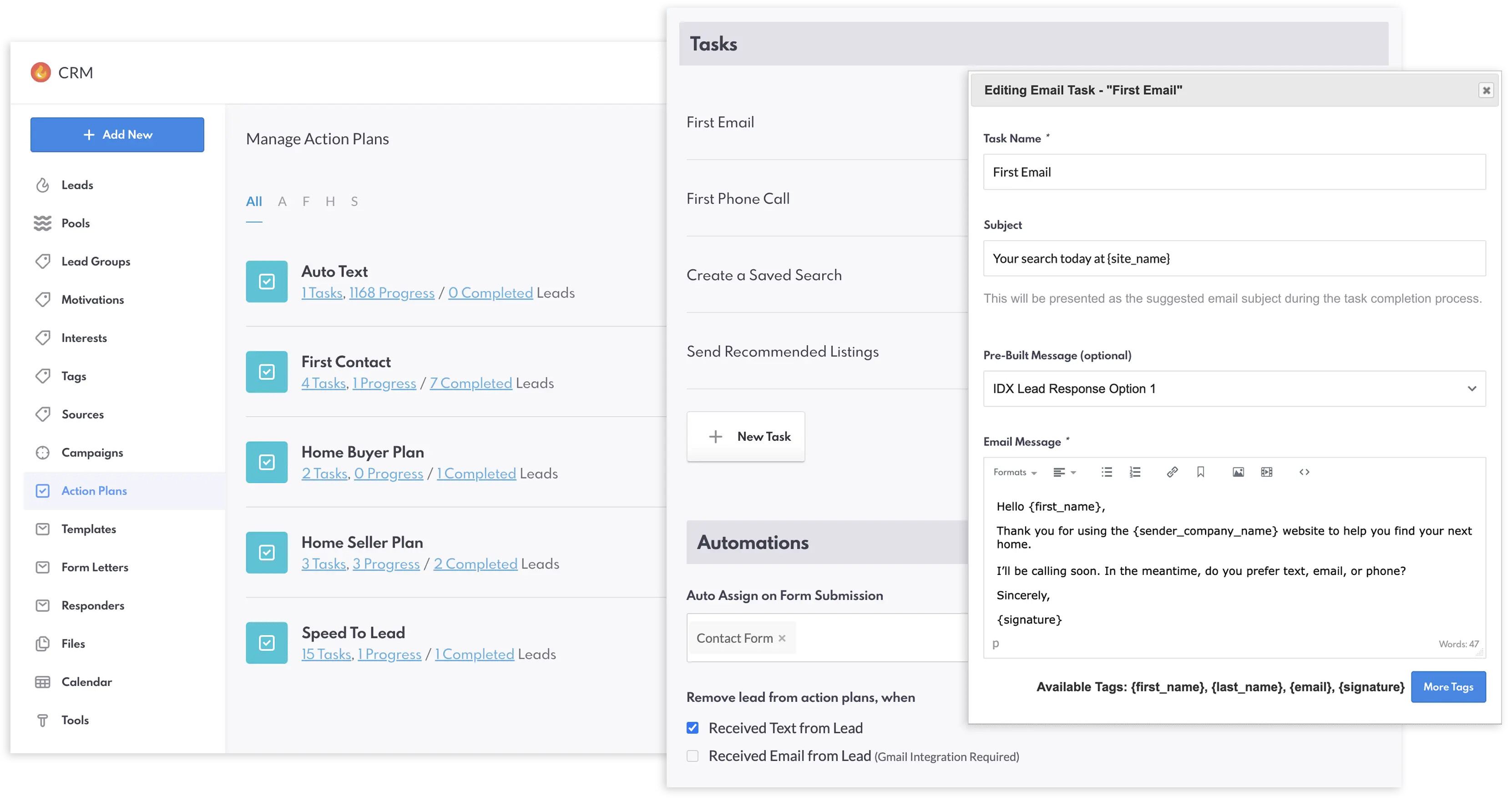 Here’s how it works: When a lead submits a form (whether it’s for buyers, sellers, or a contact form), you can automatically enroll them into a tailored Action Plan. These plans guide you on exactly when to call, text, or email the lead, so you never miss a step. And if they respond? The system can automatically remove them from the plan to keep conversations fresh and relevant.