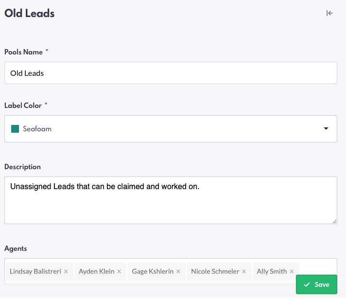 To create a new pool got to My Setup in the Leads view and select the ‘+ New Pool’ button. You will then be able to add a name, description, color label and add the Agents that can access this pool to claim leads.