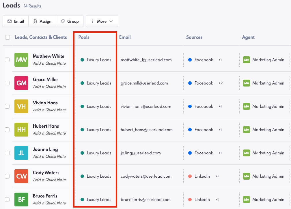 Pools are a new feature that allows another way to categorize and organize leads. With unassigned leads you are able to add them to a pool. Then agents who are looking to work new leads can access the pool and select the leads to take them from the pool to assign to themselves. Here is a user guide video to explain pools further. Lead Pools