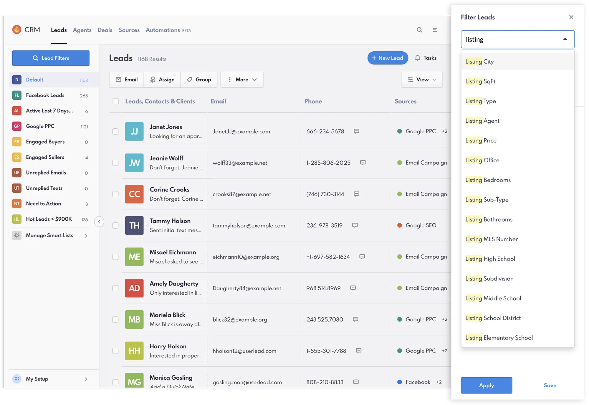Property Search Filters in Lead View: Filter leads based on property details like price, location, MLS number, and more to tailor your outreach effectively.