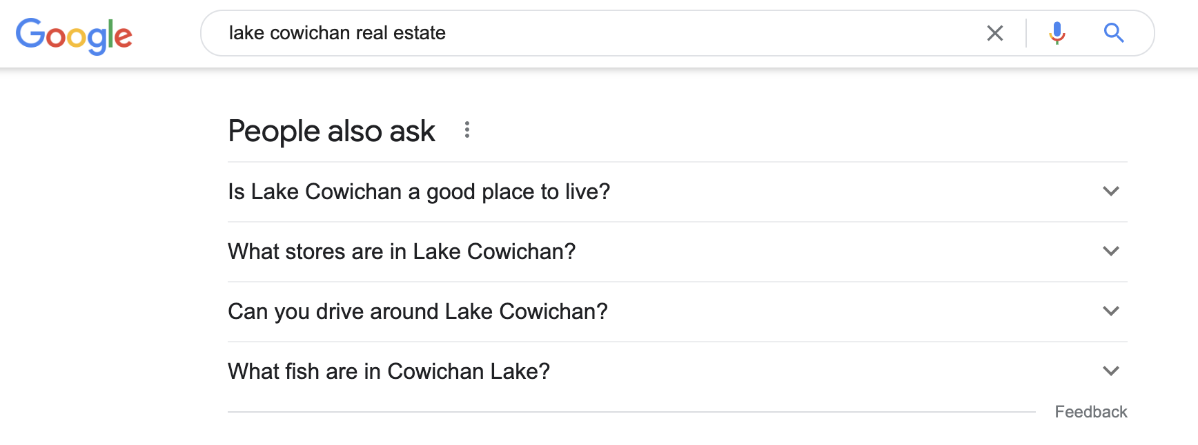 What if you don’t know what questions to ask? Well, just Google the main topic you’re interested in (In this case I’ll Google Lake Cowichan Real Estate) scroll down a bit and Google will often give you a list of questions.