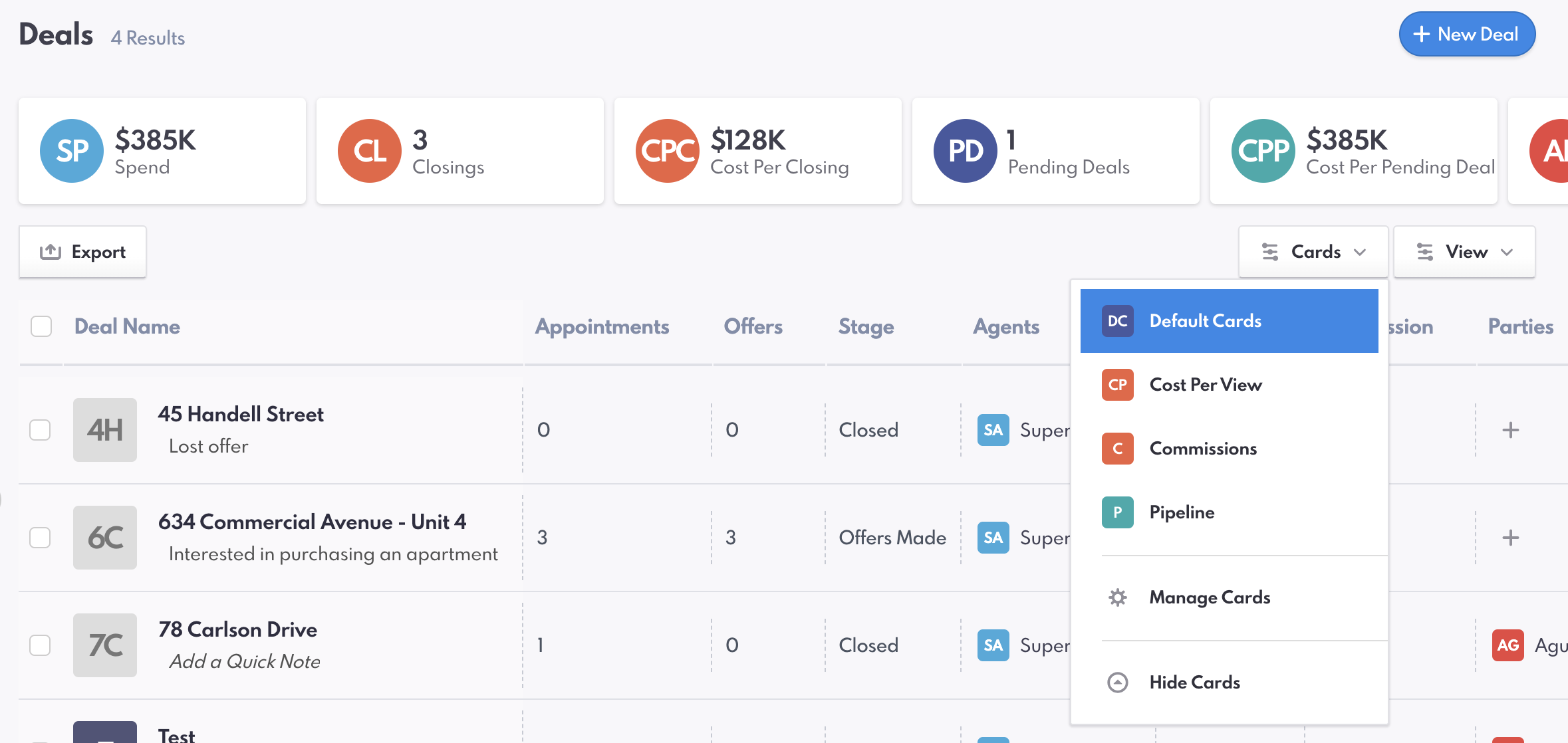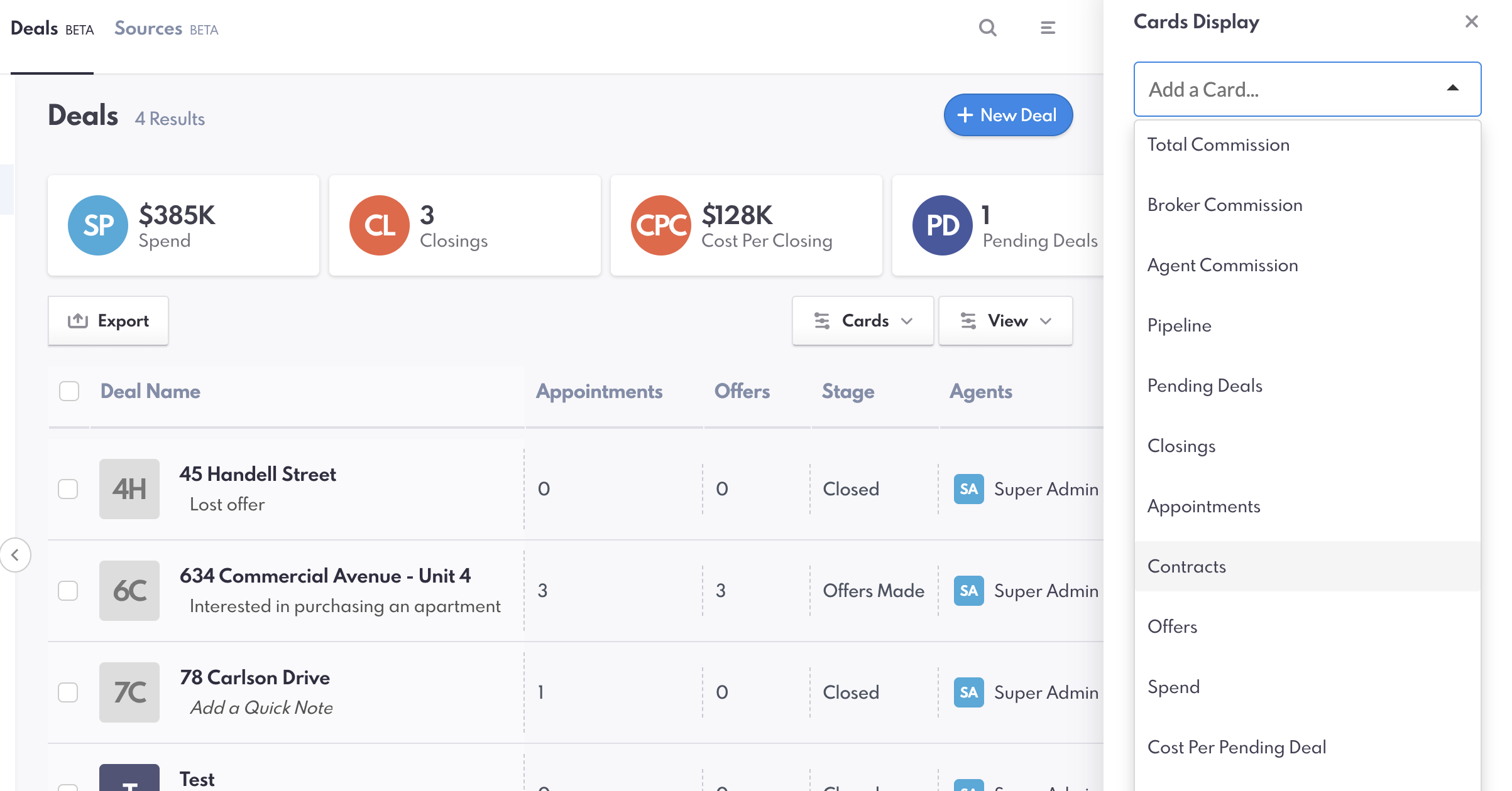 In the first version of the beta, the cards were fixed and there were only 4 or 5 (Sales Volume, Agent and broker commission, Pipeline etc