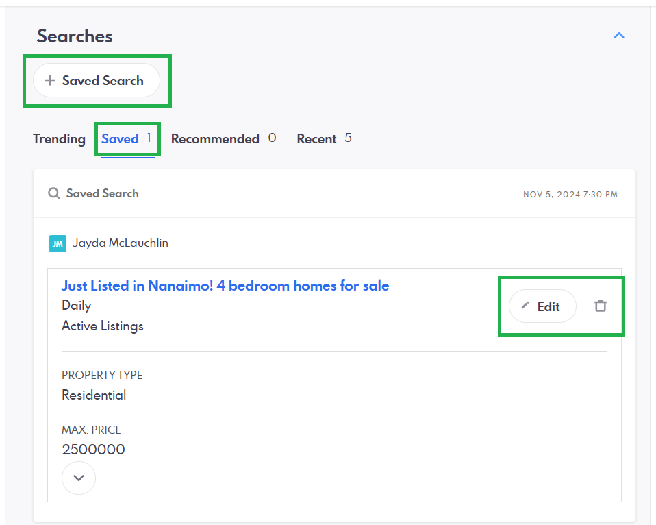Hi @Carly! I’d be happy to help, you can do this by going to your client’s lead details page in the backend and scroll down to the Searches panel, from there you will be able to see the existing searches, each will have an edit and delete button, and you will also see a + Saved Search button which will allow you to create a new one from scratch, let me know how it goes!