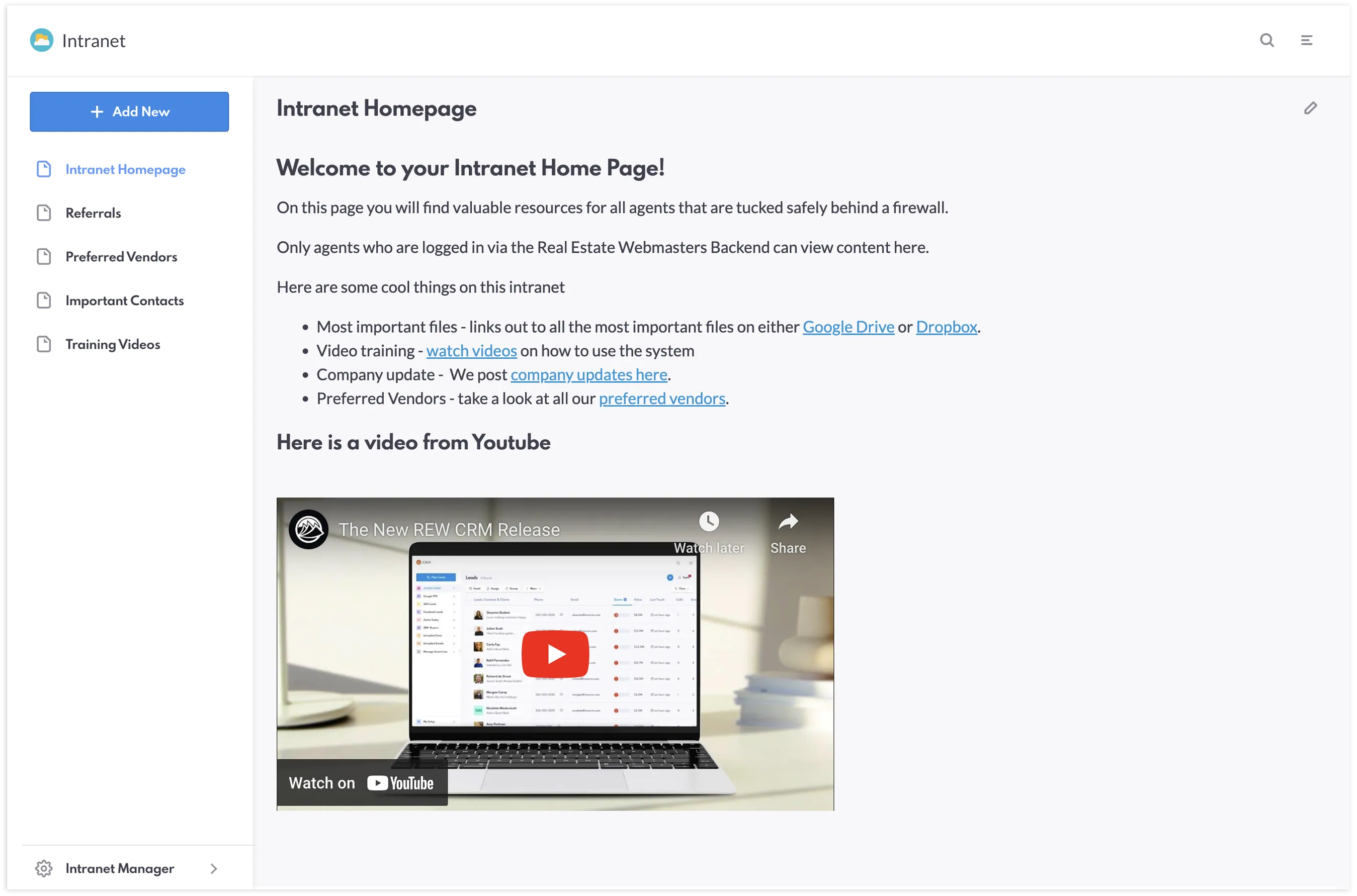 Have you ever tried organizing all your team resources in one place? It can be pretty challenging! This pain point is one of the inspirations for why we created REW CRM’s Intranet. The Intranet is your very own private hub to securely store and share company resources, which is perfect for streamlining communication.